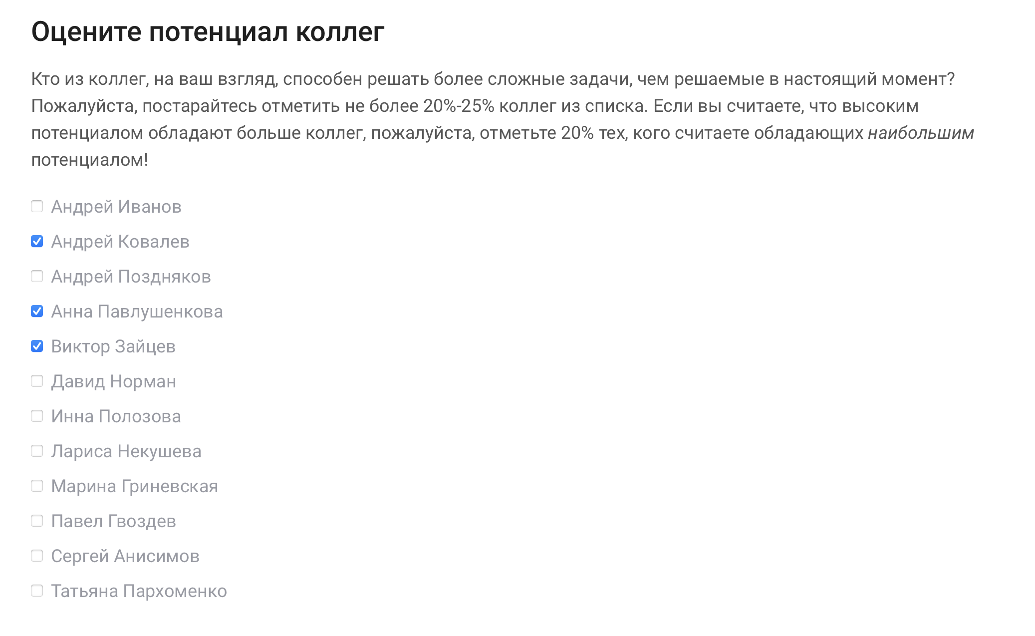 Один из результатов в исследовании взаимодействий в «Азимуте» — оценка потенциала сотрудника глазами коллег. На рисунке ниже приведен вопрос, оценивающий «обобщенный» потенциал. Для оценки более конкретных проявлений, связанных с требованиями к должности, мы добавим соответствующие вопросы в опросник. Ограничения на возможное количество «галочек в ответах» — важная особенность вопроса — респондент не может отметить высокий потенциал всех оцениваемых и вынужден выбирать коллег, действительно готовых решать более сложные задачи.